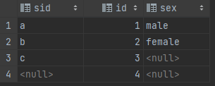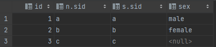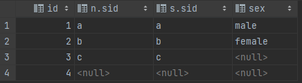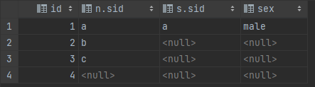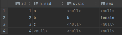 sidが同一のところのみ結合される。なお、一方でもnullの場合は評価値はnullになるので、N.sidやS.sidのいずれかがnullのカラムは抽出されません。また、両方がnullの場合でもnullを返すので同様です。